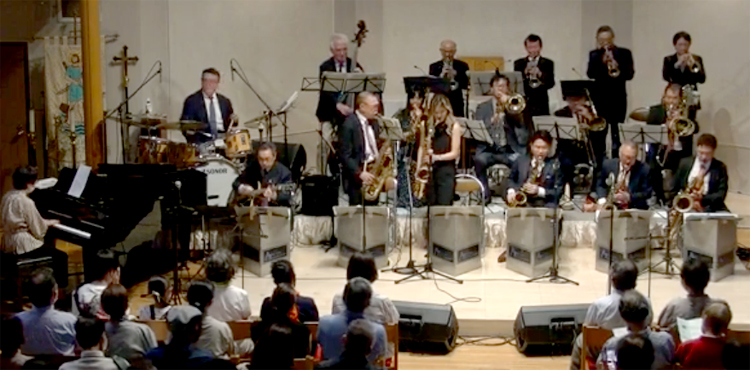 2001年に始まった聖アンデレ教会でのチャリティコンサートが22回目となった。今回初参加は4th Tp臼井明彦、2ndTs善方寛、BTb 舛本文春、久しぶりの参加はDr 上田健史、2ndTs本田朋子、そしてVocalの竹下ユキとなった。今回は本田と北村というお二人クラリネットの名手が参加しているので躊躇なくグレンミラーのMoonlight Serenadeを選曲に加えた。結果、来場者アンケートで良かった曲の第1位に輝いた。2位は讃美歌の古典をジャズにアレンジしたJesus Loves Me となった。アンコールの'SWonderfulでのボーカルデュエットを含め、18曲が満席の教会聖堂に響いた。